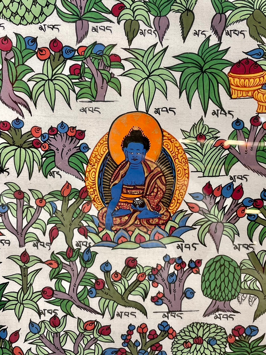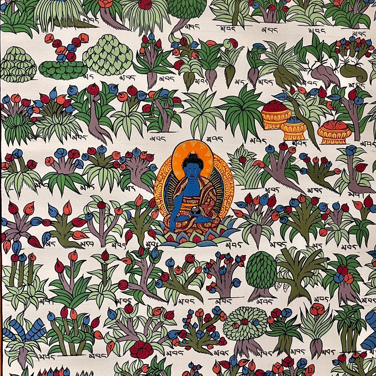 此幅《藥師佛本草圖》唐卡,以藍色身相的藥師琉璃光如來為中心,周圍密布喜馬拉雅高山藥草與植物圖譜,呈現藏傳佛教與藏醫學密不可分的智慧體系。